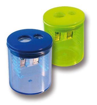 Dwuotworowa, plastikowa temperówka EISEN 513C z cylindrycznym pojemnikiem , niemieckie wysokogatunkowe ostrza firmy EISEN, różne kolory korpusów.