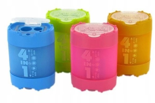 Temperówka KUM 4in1 z pojemnikiem Temperówka posiada otwory na cztery rozmiary kredek: 7 + 10 mm, 8+ 11 mm mix kolorów - wybierane losowo