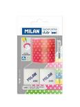 Podwójna temperówka (jedna standardowa temperówka i jedna temperówka MAXI). Temperówka posiada ostre i odporne ostrze ze stali węglowej, co czyni go idealnym dla wszystkich rodzajów ołówków. Ma również system ostrzy bezpieczeństwa, który zapobiega oderwaniu się ostrza od korpusu temperówki. Idealny do użytku w szkole. Zaprojektowany w Hiszpanii przez dział R & D firmy MILAN, miękka syntetyczna gumka kwadratowa. Może być używany do usuwania szerokiego zakresu pociągnięć ołówkiem ze wszystkich rodzajów papieru.