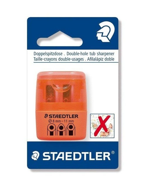 Podwójna temperówka do ostrzenia ołówków i kredek o średnicy od 8 do 11 mm • Do temperowania sześciokątnych, trójkątny lub okrągłych kredek i ołówków • Metalowy wkład temperówki • Mocny pojemnik chroni ścinki przed rozsypaniem