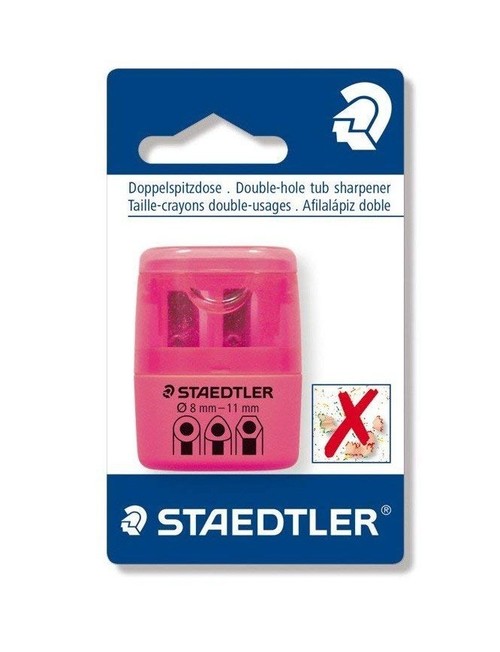 Podwójna temperówka do ostrzenia ołówków i kredek o średnicy od 8 do 11 mm • Do temperowania sześciokątnych, trójkątny lub okrągłych kredek i ołówków • Metalowy wkład temperówki • Mocny pojemnik chroni ścinki przed rozsypaniem