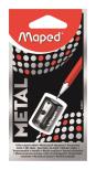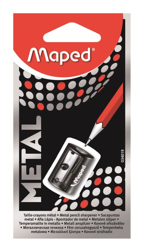 Niewielka i solidna temperówka metalowa o obłym kształcie. mix kolorów czarny i srebrny, 1 otwór. Blister 1 sztuka.