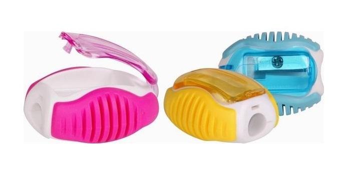 Plastikowa temperówka z gumowym uchwytem do zacinania standardowych (8 mm) kredek i ołówków, miks kolorów w praktycznym PVC pudełku