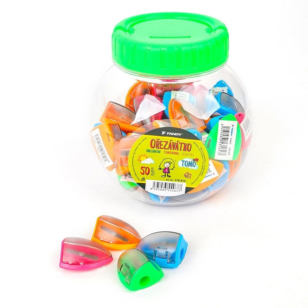 plastikowa temperówka z gumowym uchwytem i pojemnikiem na odpady, pasująca do piórników, różne kolory w pudełku z PVC, 50 sztuk w opakowaniu