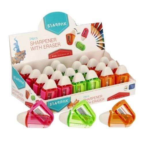 Temperówka z gumką z kolekcji STARPAK dedykowanej dla biura i szkoły. Temperówka wykonana z lekkiego plastiku, z gumką do mazania i trzech kolorach: zielonym, pomarańczowym oraz różowym. Temperówka z pojemnikiem na strużyny przeznaczona do temperowania kredek i ołówków.
