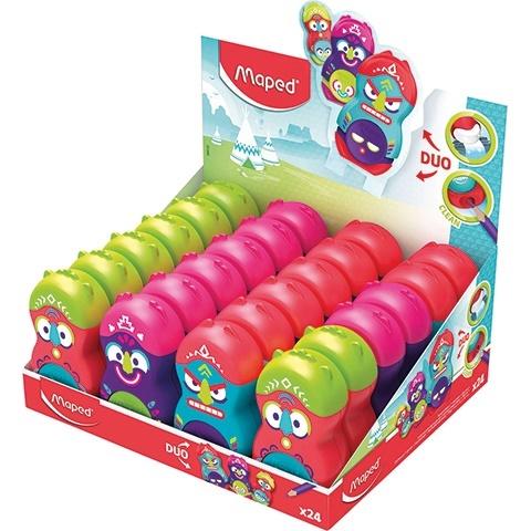 Temperówka z gumka LOOPY TOTEM. Gumka okragla, obrotowa, nie zawiera PVC. Temperówka z jednym otworem. Plastikowa klapka zamykajaca otwór zapobiega wysypywaniu sie trocin i pylu grafitowego do piórnika i tornistra. Dostepna w trzech wersjach kolorystycznych: fioletowo-rózowa, czerwono-zielona i niebiesko-czerwona. JS display 24 sztuki.