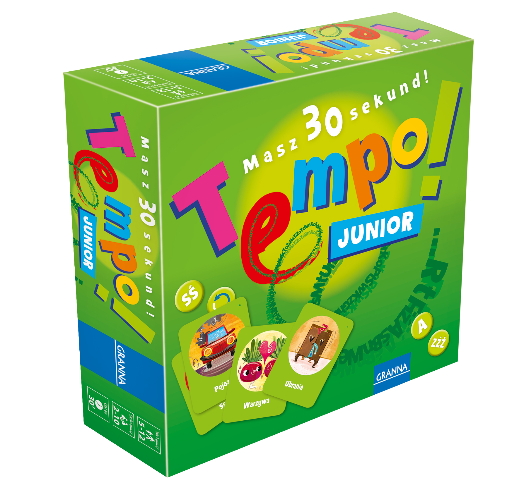 Tempo Junior to wesoła gra planszowa, w której zadaniem graczy będzie wymyślanie słów pasujących do zadanego tematu. Oprócz doskonałej zabawy nad planszą pomaga rozwijać kreatywne myślenie, wyczucie czasu i wzbogaca słownik najmłodszych graczy. Gra zawiera 4 warianty rozgrywki, dzięki czemu można ją łatwo dopasować do wybranej grupy wiekowej. Wiek graczy: 5-12 Liczba graczy: 2-10