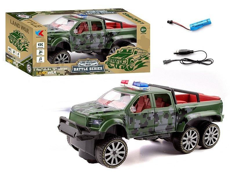 auto wojskowe 1:16 na baterie, 27x11x11cm, 6 kołowe, światła, kabel USB i akumulator; 28x11,5x11,5cm, W/B