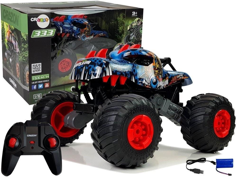 Samochód Auto Terenowe Duże Koła Dinozaur Zdalnie Sterowany 2.4G Terenowe wyprawy i moc adrenaliny oraz niespotykany wygląd to właśnie zainteresuje wszystkich fanów motoryzacji. Jeżeli chcesz poczuć przygodę rajdowca terenowego i przenieś się w świat dinozaurów to będzie idealny zestaw dla Ciebie. Będzie mógł tworzyć swoje własne tory przeszkód, trudne trasy na swoim terenie. Sprawi mu to dużo frajdy i urozmaici zabawę z rówieśnikami. Niesamowite parametry i wygląd sprawiają, że to doskonały pojazd dla młodszych, jak i starszych chłopców. Zestaw zawiera wygodny kontroler, dzięki czemu możesz czerpać maksymalna przyjemność z jazdy. Nadaje na częstotliwości 2,4 G. Można nim sterować przód, tył i na boki. Pojazd posiada masywną, terenową konstrukcję, ogromne, szeroko rozstawione koła o wielkości 10 cm, odznaczają się z daleka i dają wrażenie potęgi auta. Miękkie, gumowe koła pojazdu gwarantują dużą przyczepność auta do różnego rodzaju podłoża. Kolorowe obrazki i czerwone koła oraz szkieletowa budowa zwróci uwagę każdego fana motoryzacji. Na dachu posiada czerwone łuski jak prawdziwy dinozaur. - Bateria litowa: 7,4 V/ 1200 mAh - Częstotliwość: 2.4G - Prędkość: 15 km/h - Skala: 1:16 Elementy zestawu: - auto terenowe dinozaur - ładowarka USB - bateria 7,4 V 1200 mAh - pilot Wymiary pojazdu: 29 cm x 26 cm x 24 cm Średnica koła: 8 cm Wymiary pilota: 13 cm x 12 cm x 5 cm Wymiary pudełka: 44 cm x 28,5 cm x 30 cm Auto zasilane jest bateria 7,4 V 1200 mAh, która dołączona jest do zestawu. Do pilota należy użyć 2 baterii "AA" 1,5 V (brak w zestawie). Zabawka przeznaczona jest dla dzieci powyżej 6. roku życia. Zestaw posiada certyfikat CE i jest zgodny z normą EN 71. Zapakowany jest w kartonik z przezroczystą witrynką, dzięki czemu nadaje się idealnie na prezent.