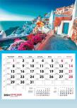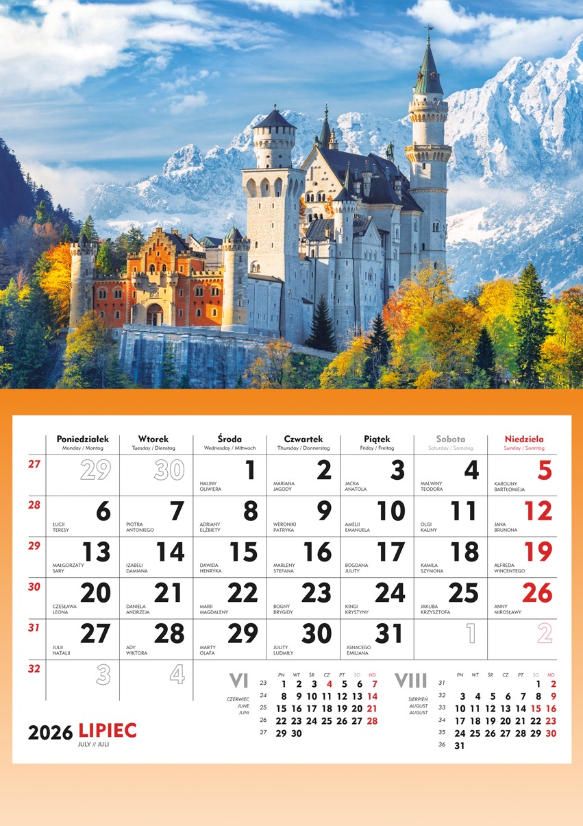 Główka pełnokolorowa, okienko przesuwane, nazwy miesięcy i tygodni w wersjach językowych, miejsce na nadruk reklamowy.