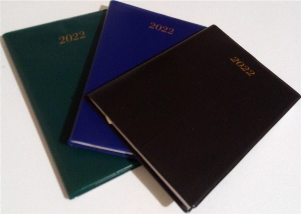 Kalendarium dwukolorowe, w rozkładzie tydzień na dwóch stronach. Terminarz w formacie A6, ( 14,5 x 10 cm) i objętości 112 stron. Wewnątrz kalendarze skrócone, notatnik, miejsce do zapisywania nr. telefonów, tasiemka do zaznaczania dni. Okładka z kartonu, zabezpieczona folią, w kolorach czarnym, zielonym i granatowym (do wyboru). Zgrabny, lekki.