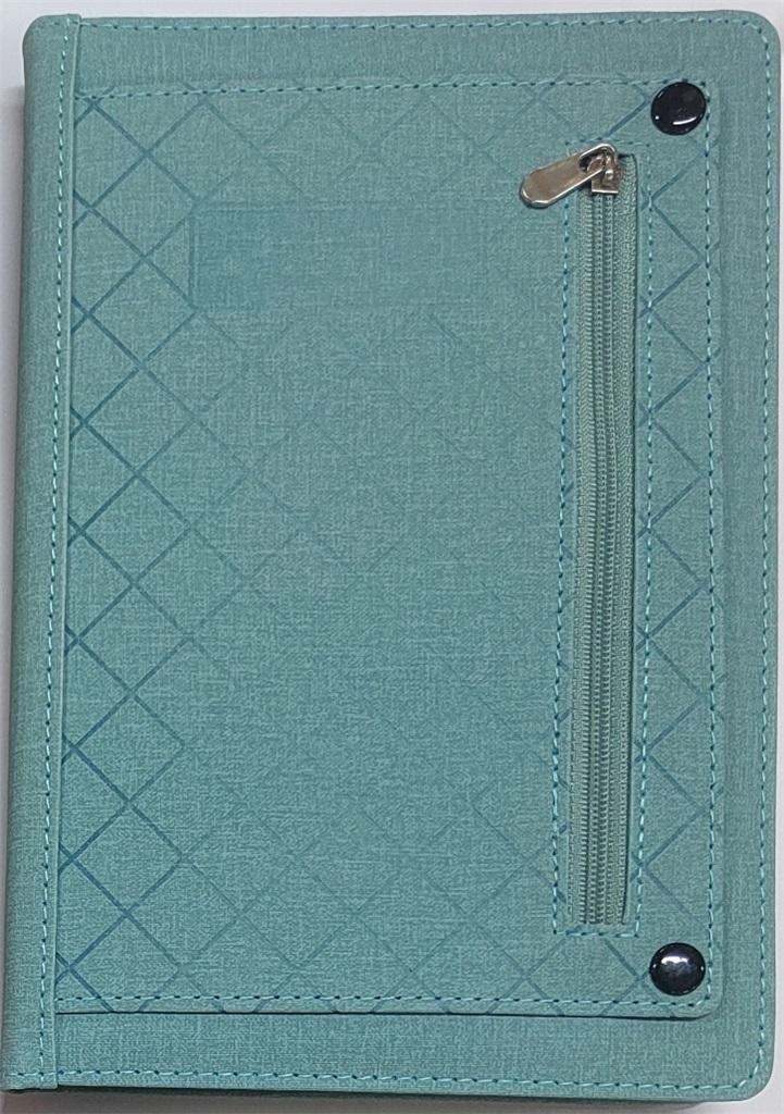 OKŁADKA: THERMO PU miękka z gąbką 3 mm, przeszycie wokół oprawy, tłoczona, z kieszonką zasuwaną na suwak.
