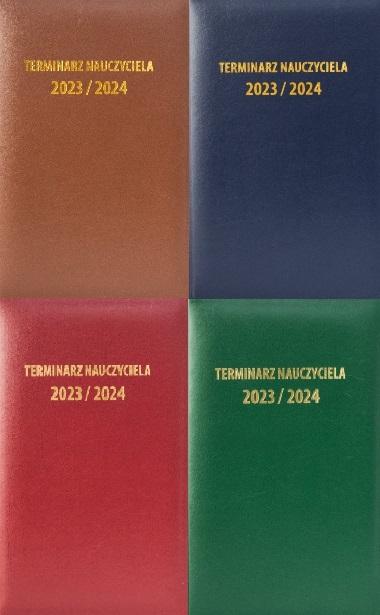 Okładka - miękka, skóropodobna z gąbką 3mm i obszyciem, złocenie "Terminarz Nauczyciela 2023/2024"