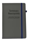 OKŁADKA: twarda, matowy laminat, z gumką 7 mm i uchwytem na długopis, tłoczenie "Terminarz nauczyciela 2025/2026", kieszonka na tylnej wklejce