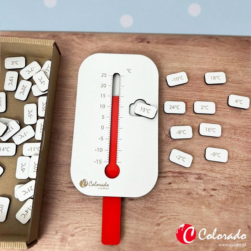 Termometr posiada ruchomy słupek rtęci. Zadaniem dziecka jest ustawienie odpowiedniej temperatury na słupku oraz dopasowanie puzzla z wartością temperatury