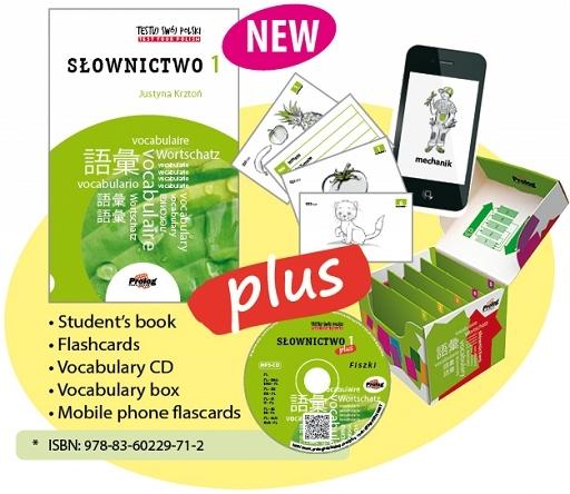 Słownictwo 1 PLUS"" to pozycja dla wszystkich, którzy chcą w optymalnie efektywny sposób uczyć się polskich słówek. W pracy z tym materiałem maksymalnie skorzystają zarówno wzrokowcy jak i słuchowcy.Przedstawiciele aż pięciu kręgów językowych znajdą na fiszkach precyzyjne tłumaczenia słówek we własnym języku(angielski, niemiecki, włoski, hiszpański, rosyjski).Pakiet Słownictwo 1 PLUS zawiera:Książkę ""Testuj Swój Polski Słownictwo 1""*ilustrowane fiszki, przetłumaczone na pięć języków (ANG, DE, IT, ES, RUS)pudełko na fiszki (do samodzielnego złożenia)płytę MP3 z nagranymi 471 fiszkami (ANG, DE, IT, ES, RUS), które można odtwarzać również na urządzeniach mobilnych**Audiofiszki zestawu PLUS są dostępne w postaci plików na płycie CD mp3, można je pobrać również ze strony (link do strony i QR kod zamieszczone są na płycie), użytkownicy systemu Android mogą zainstalować fiszki w formie aplikacji (do pobrania w Sklepie Play).*Książka ""Słownictwo 1"" zawiera:70 testów i ćwiczeń + kluczbogato ilustrowane, motywujące do nauki i różnorodne ćwiczenia zadania jedno- i wielokrotnego wyboru, uzupełnianie, dopasowywanie, komiksy i innesłowniczek PL / ENG / DEwskazówki dla użytkownika""TESTUJ SWÓJ POLSKI SŁOWNICTWO 1"" to zbiór ćwiczeń, które można wykorzystać do samodzielnej nauki oraz jako materiał pomocniczy do zajęć w grupie. Książka przeznaczona dla dorosłych i młodzieży na poziomach A1-A2.**Użytkownicy systemu Android, w ramach zakupu pakietu PLUS, pobrać mogą ze Sklepu Play aplikację z nagraniami fiszek.Użytkownicy, którzy nie zakupili zestawu PLUS i nie posiadają kodu dostępu, skorzystać mogą z trzech pierwszych ćwiczeń w aplikacji.