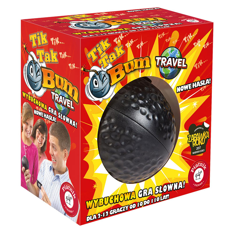 Wybuchowa gra słowna w nowej wersji! Nie dla bojaźliwych! Los każdego gracza wisi na włosku, gdy ta piekielna bomba zaczyna tykać. Trzeba nie lada opanowania, by w takiej sytuacji znaleźć odpowiedni wyraz i pozbyć się bomby, zanim nastąpi wybuch! Kultowa gra Piatnika teraz również w wersji podróżniczej, dzięki czemu można ją zabrać na wakacje, w podróż czy na piknik do parku! Zabawa i emocje gwarantowane! Kreatywność nie lubi się z presją czasu. Czy byłbyś w stanie wymyślić słowo kończące się na dany zlepek liter, trzymając w ręce tykającą bombę, która może wybuchnąć w każdej chwili? Oto genialna w swojej prostocie gra imprezowa, która rozerwie każdego. Gra wymaga opanowania i refleksu, a także ćwiczy kreatywność, spontaniczność i słownictwo. Tik Tak Bum idealnie sprawdzi się na spotkaniach ze znajomymi czy rodziną i zapewni każdemu dużo radości. Teraz dzięki mniejszym gabarytom opakowania, grę można wygodnie zabrać ze sobą na różne wydarzenia. 50 dwustronnych kart zapewnia wiele ciekawych i zabawnych rozgrywek na długi czas. Przez około pół minuty tykająca bomba wystawia graczy na próbę. Losowana jest karta zawierająca kilka liter. Uruchamiany jest mechanizm zegarowy na losowy czas (od 10 do 60 sekund) i pierwszy gracz bierze bombę do ręki. Gracz, na którego przypada kolejka, musi podać wyraz zawierający litery wylosowane na karcie i przekazać bombę sąsiadowi z lewej, zanim nastąpi wybuch! Często wyraz, który wymyślisz oczekując na swoją kolej, zostanie zużyty przez poprzedniego gracza i nawet osoby posiadające bardzo bogaty zasób słów mogą poczuć pustkę w głowie. Proste zasady, maksimum zabawy! Ze wszystkich przetasowanych kart losujemy 10 i układamy je jednym kolorem do góry. Następnie rozpoczynający gracz bierze do ręki bombę, naciska umieszczony na niej przycisk i odwraca wierzchnią kartę. Musi teraz wypowiedzieć wyraz, zawierający podaną na karcie grupę liter. Może ona znajdować się na początku, na końcu lub w środku wyrazu. Nie można jednak zmieniać kolejności liter ani umieszczać innych liter wewnątrz podanej na karcie sekwencji. W grze można używać wyłącznie rzeczowników pospolitych (rozpoczynających się małą literą) w mianowniku liczby pojedynczej. Rzeczowniki nie mające liczby pojedynczej (na przykład spodnie albo widły) mogą być użyte w pierwszym przypadku liczby mnogiej. Tego samego wyrazu nie można użyć dwa razy w tej samej rundzie, natomiast może być użyty w innej rundzie, jeżeli zawiera odpowiednia grupę liter. Wymyśliłeś hasło? Szybko, podaj bombę dalej! Jeżeli udało się wymyślić słowo przed wybuchem bomby, to należy szybko podać ją kolejnej osobie. Powinna ona podać inny wyraz do tych samych warunków. Zabawa trwa do momentu kiedy bomba nie wybuchnie. Wówczas gracz, który w tym momencie trzymał bombę za karę musi zabrać kartę. Przegrany rozpoczyna kolejną rundę, a cała gra kończy się w momencie zużycia wszystkich kart ze stosu. Wygrywa gracz, który zdobył najmniej kart.