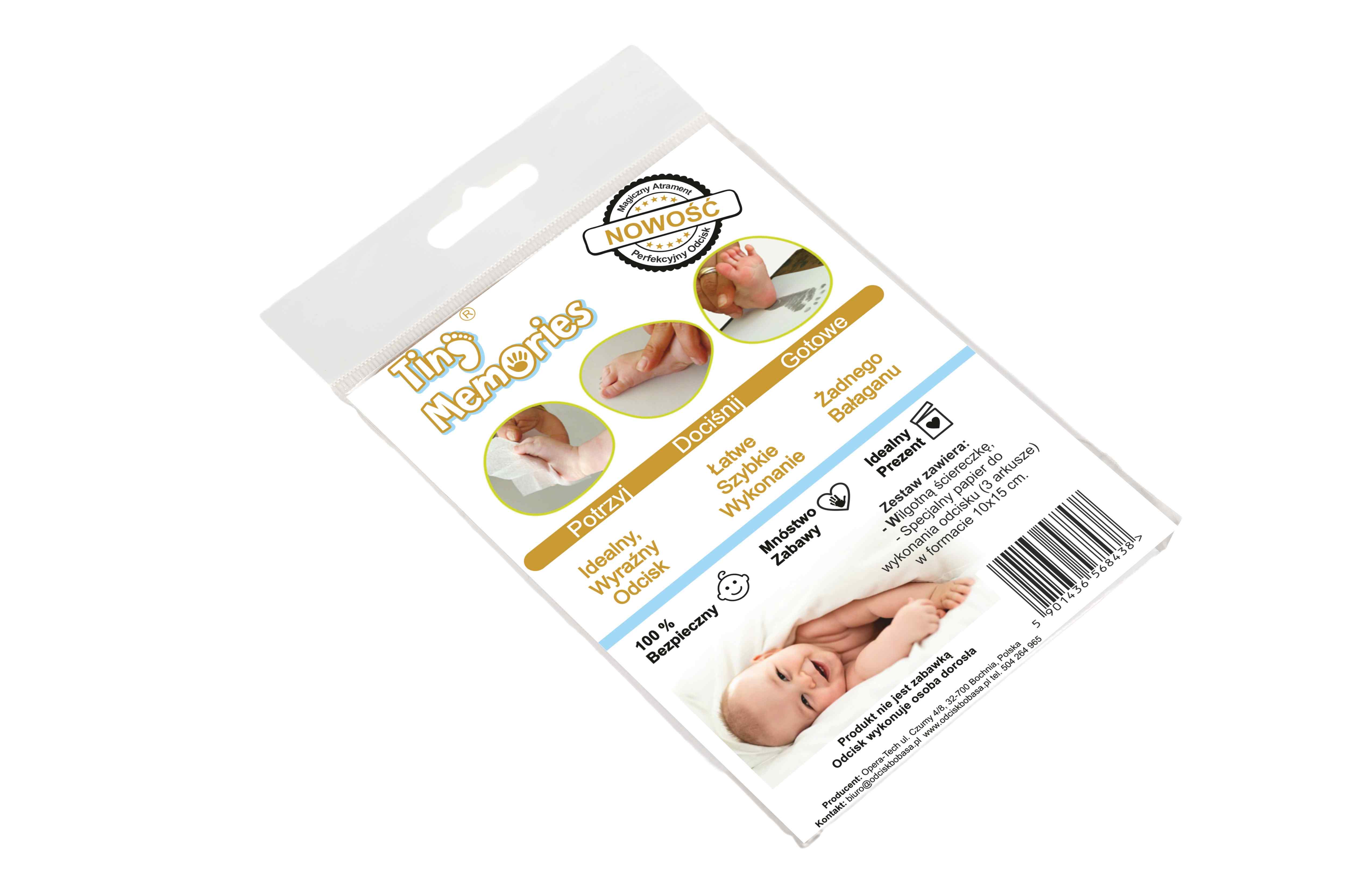 W zestawie znajduje się wilgotna ściereczka, którą zwilżamy dłoń/ stopę Dziecka, przyciskamy