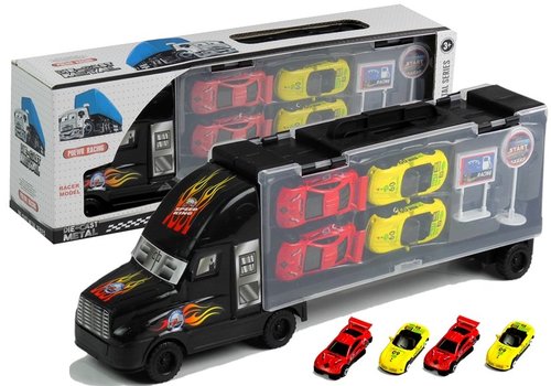 Ciężarówka z Autami Zabawka dla małych pasjonatów motoryzacji, która kryje w sobie wiele niespodzianek! Tir z naczepą wypełnioną przegrodami ze sportowymi samochodzikami będzie spełnieniem marzeń wszystkich fanów i kolekcjonerów autek. Również z drugiej strony pojazdu znajdują się wolne miejsca, w których chłopiec może umieścić przeróżne akcesoria, mogące przydać się w zabawie. Zestaw składa się z: - dużego tira, - 4 sztuk małych autek, - 2 szt znaków drogowych Duża ciężarówka, może służyć sama do zabawy lub jako przewoźnik mniejszych autek, które idealnie dopasowane i zamknięte nie wypadną podczas zabawy. W górnej części sortera znajduje się wysuwana rączka, ułatwiająca przenoszenie pojazdu, jednak podczas zabawy jest stale ukryta, nie pomniejszając komfortu jej użytkowania W tirze znajduje się 7 miejsc na autka oraz miejsca na dodatkowe elementy. Wymiary Ciężarówki :36cm x 12cm Wymiary opakowania: 37cm x 13cm x 8cm