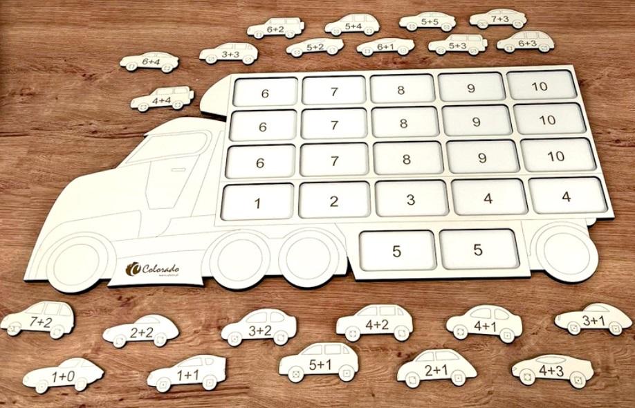 Dziecko ma za zadanie załadować tira samochodzikami w taki sposób, żeby suma dodawania na samochodziku odpowiadała miejscu na tirze np. 2+2 na samochodziku odpowiada miejscu nr 4 na tirze.