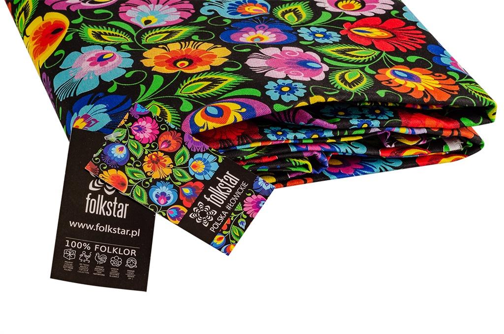 Tkanina bawełniana w łowickie kwiaty z wycinanki - czarna: wykonana ze 100% bawełny,czarna z nadrukowanymi kolorowymi kwiatami łowickimi,