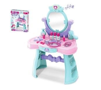 Kolorowa toaletka na baterie z wysuwaną szufladką na biżuterię. Zestaw zawiera też najbardziej potrzebne artykuły do pielęgnacji i stylizacji małej księżniczki; znajdziemy w nim m.in: suszarkę, korale, flakoniki na perfumy, szminki, szczotkę i wiele innych przydatnych artykułów do zrobienia z małej pociechy królowej balu. Toaletka jest bardzo prosta w montażu, po rozłożeniu ma wymiary 66x44x28cm. Całość spakowana jest kartonowe pudełko z poręcznym uchwytem. Zabawka działa na baterie typu AA