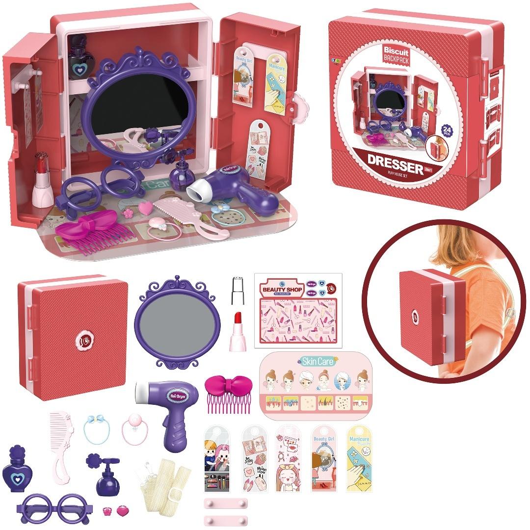 Mobilna Toaletka "Biscuit Backpack Dresser" - Zestaw Małej Stylistki w Plecaku Marzenie każdej małej modnisi o własnym kąciku do stylizacji staje się rzeczywistością dzięki naszej innowacyjnej, mobilnej toaletce "Biscuit Backpack Dresser"! Ten uroczy zestaw w formie plecaka to idealne rozwiązanie dla dziewczynek, które uwielbiają bawić się w makijaż, fryzury i dbanie o urodę, a jednocześnie cenią sobie możliwość przenoszenia swojej zabawkowej kolekcji w dowolne miejsce. Funkcjonalność i Kreatywna Zabawa: Ten niezwykły plecak po rozłożeniu zamienia się w pełnoprawną toaletkę z lustrem w ozdobnej ramie. Zestaw zawiera bogactwo akcesoriów, które pozwolą na odgrywanie ról w salonie piękności: Akcesoria do stylizacji włosów: Zabawkowa suszarka, grzebień, spinki, gumki do włosów. Akcesoria do "makijażu" i pielęgnacji: Atrapy szminek, flakoniki "perfum" i "balsamów", udawane okulary, "kolczyki". Dodatkowe elementy: Mała tekturka "Beauty Shop" imitująca sklep z kosmetykami, "Skin Care" i "Manicure" karty, które inspirują do zabawy w pielęgnację. Wszystkie elementy są starannie wykonane z dbałością o detale, a otwory i wieszaki w toaletce pozwalają na uporządkowane przechowywanie akcesoriów. Edukacja przez Zabawę: Zabawa w stylizacje i pielęgnację rozwija u dziecka: Kreatywność i wyobraźnię: Pozwala na tworzenie własnych stylizacji i odgrywanie ról. Zdolności manualne: Precyzyjne operowanie małymi akcesoriami. Umiejętności społeczne: Idealna do zabawy z rówieśnikami, w udawanie "klientki" i "fryzjerki/makijażystki". Dbanie o porządek: Zachęca do układania akcesoriów po skończonej zabawie. Wygodny Plecak do Przenoszenia: Po zakończeniu zabawy, cała toaletka wraz z akcesoriami składa się do kompaktowej formy plecaka. Dzięki temu dziecko może zabrać swój ulubiony zestaw ze sobą do przyjaciół, rodziny, czy na wakacje, ciesząc się zabawą w dowolnym miejscu. Plecak ma regulowane szelki, co zapewnia komfort noszenia. Specyfikacje: Wymiary: 19x20x9 cm Materiał: Wysokiej jakości, bezpieczne dla dzieci tworzywo sztuczne Zawartość Zestawu: Składana toaletka w formie plecaka, lustro, zabawkowa suszarka, grzebień, szminka, flakoniki, spinki, gumki, pierścionki, okulary, tekturki imitujące kosmetyki (łączna liczba elementów: 24+ pcs,). Zalecany Wiek: Od 3 lat Mobilna Toaletka "Biscuit Backpack Dresser" to idealny prezent dla każdej dziewczynki, która marzy o własnym kąciku piękności i uwielbia kreatywną zabawę w odgrywanie ról!