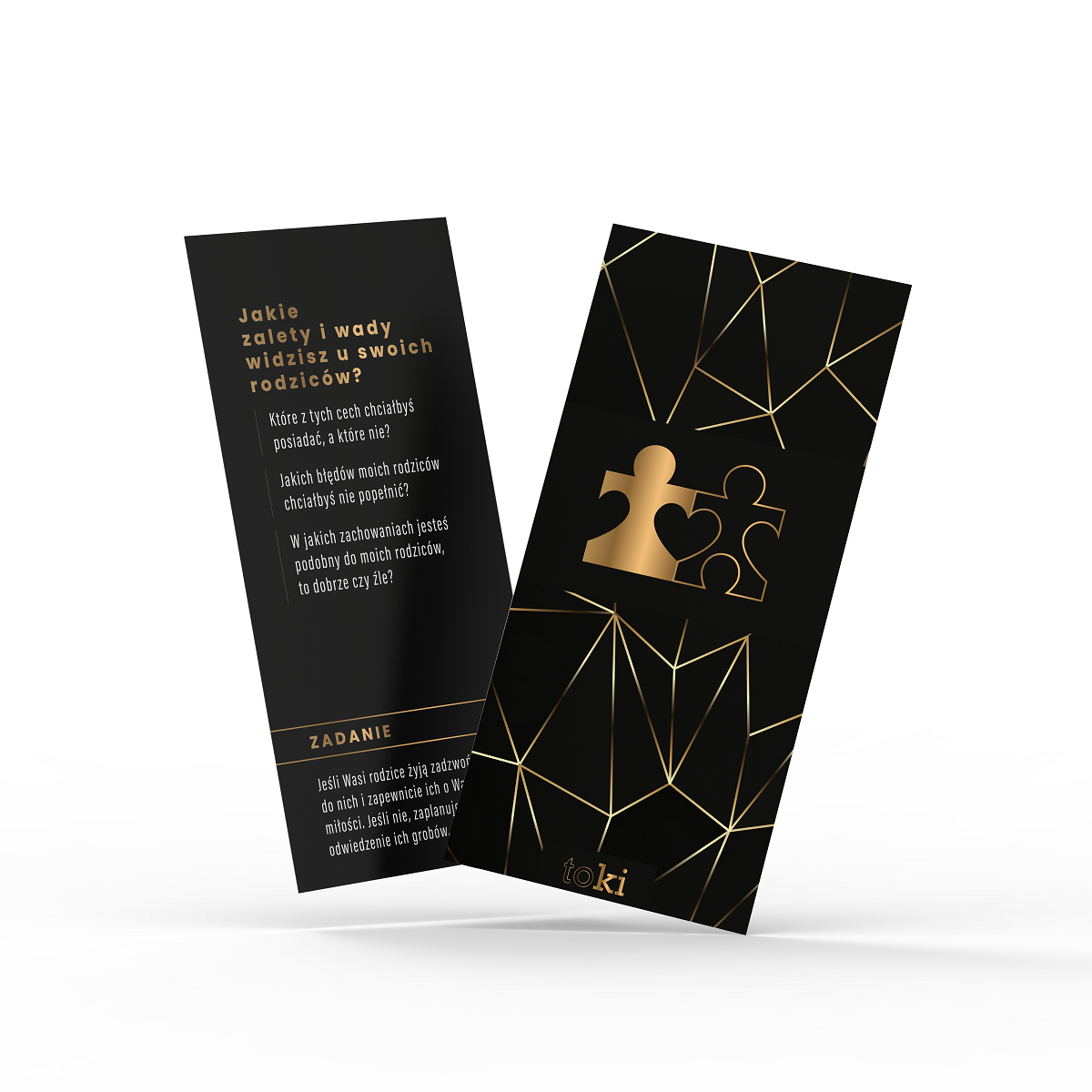 TOKI to książka z wyrywanymi kartkami, dzięki czemu zamienia się w talię. Talia składa się ze stu kart. Każda karta to osobny scenariusz rozmowy w Twoim związku. Każdy scenariusz składa się z pytania głównego określającego temat i dwóch lub trzech pytań pomocniczych. Na koniec każdej rozmowy proponujemy wykonanie konkretnego zdania, które ma urzeczywistnić omawiany temat i jeszcze silniej umocnić Waszą więź.