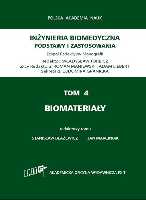 SPIS TREŚCI Wstęp 1. Biomateriały - definicje, podział i kryteria jakości 1.1. Definicje, podział 1.2. Kryteria jakości i typowe własności biomateriałów 2. Badania biozgodności materiałów implantacyjnych 2.1. Wprowadzenie 2.2. Badania in vitro 2.3. Badania in vivo 2.4. Badania przedkliniczne i klinicczne biomateriałów na zwierzętach 3. Wybrane zagadnienia inżynierii biomateriałów 3.1. Specyfika środowiska tkanek i płynów fizjologicznych 3.2. Identyfikacja i analiza parametrów geometrycznych mechanicznych w układach tkanki-implanty z wykorzystaniem metod komputerowych 3.3 Problemy stosowania metod komputerowych do analizy struktur tkankowych 4. Biomateriały metalowe 4.1. Stale austenityczne 4.2. Tytan i stopy tytanu 4.3. Stopy na osnowie kobaltu 4.4. Stopy z pamięcią kształtu 4.5. Stopy na osnowie metali szlachetnych 4.6. Korozja biomateriałów metalowych 4.7. Biomateriały metalowe w zastosowaniach funkcjonalnych 4.8. Biozgodność biomateriałów metalowych 5. Biomateriały polimerowe 5.1. Wprowadzenie - materiały polimerowe w medycynie 5.2. Reakcje i procesy polimeryzacji 5.3. Właściwości polimerów i metody ich charakteryzowania 5.4. Mechanizmy oddziaływania polimerów ze środowiskiem biologicznym 5.5. Polimery niedegradowalne 5.6. Polimery degradowalne i resorbowalne 5.7. Włókna i nanowłókna polimerowe 5.8. Membrany polimerowe 5.9. Hydrożele 5.10. Nanocząstki polimerowe 6. Biomateriały ceramiczne 6.1. Ceramika tlenkowa i nietlenkowa 6.2. Bioceramika aktywna na bazie fosforanów wapnia 6.3. Bioaktywne szkła i materiały szkło-ceramiczne 6.4. Materiały bioaktywne pochodzenia żelowego 6.5. Cementy kostne i stomatologiczne 6.6. Ceramiczne nośniki leków 6.7. Pokrycia bioceramiczne 7. Biomateriały węglowe i kompozytowe 7.1. Wprowadzenie 7.2. Węgiel włóknisty 7.3. Węgiel aktywny i węgiel szkło-podobny 7.4. Powłoki węglowe w medycynie 7.5. Materiały grafenowe 7.6. Nanorurki i nanowłókna węglowe 7.7. Kompozyty włókniste - przydatność w medycynie 7.8. Kompozyty zawierające inne fazy modyfikujące 7.9. Przykłady zastosowań materiałów kompozytowych w medycynie 8. Materiały dla inżynierii tkankowej i medycyny regeneracyjnej 8.1. Wprowadzenie 8.2. Budowa i funkcja macierzy zewnątrzkomórkowej (ECM) 8.3. Biomimetyczne podłoża komórkowe 8.4. Metody formowania podłoży dla inżynierii tkankowej i medycyny regeneracyjnej 8.5. Podłoża jako nośniki związków biologicznie aktywnych 8.6. Komórki macierzyste w medycynie regeneracyjnej 9. Nanomateriały i nanomedycyna 9.1. Wprowadzenie 9.2. Nanotechnologia w medycynie 9.3. Nanomateriały w naonmedycynie 9.4. Nanomateriały w diagnostyce i terapii antynowotworowej 9.5. Wybrane zastosowania nanocząsteczek w medycynie 9.6. Nanoformy węgla - nośniki leków, terapia genowa, obrazowanie medyczne 10. Dekontaminacja wyrobów medycznych 10.1. Wprowadzenie 10.2. Czyszczenie i dezynfekcja 10.3. Pakowanie 10.4. Sterylizacja 11. Wyroby medyczne - klasyfikacja, procedury zgodności i zarządzania ryzykiem 11.1. Wprowadzenie 11.2. Klasyfikacja wyrobów medycznych 11.3. Procedury oceny zgodności wyrobów medycznych 11.4. Analiza ryzyka wyrobów medycznych