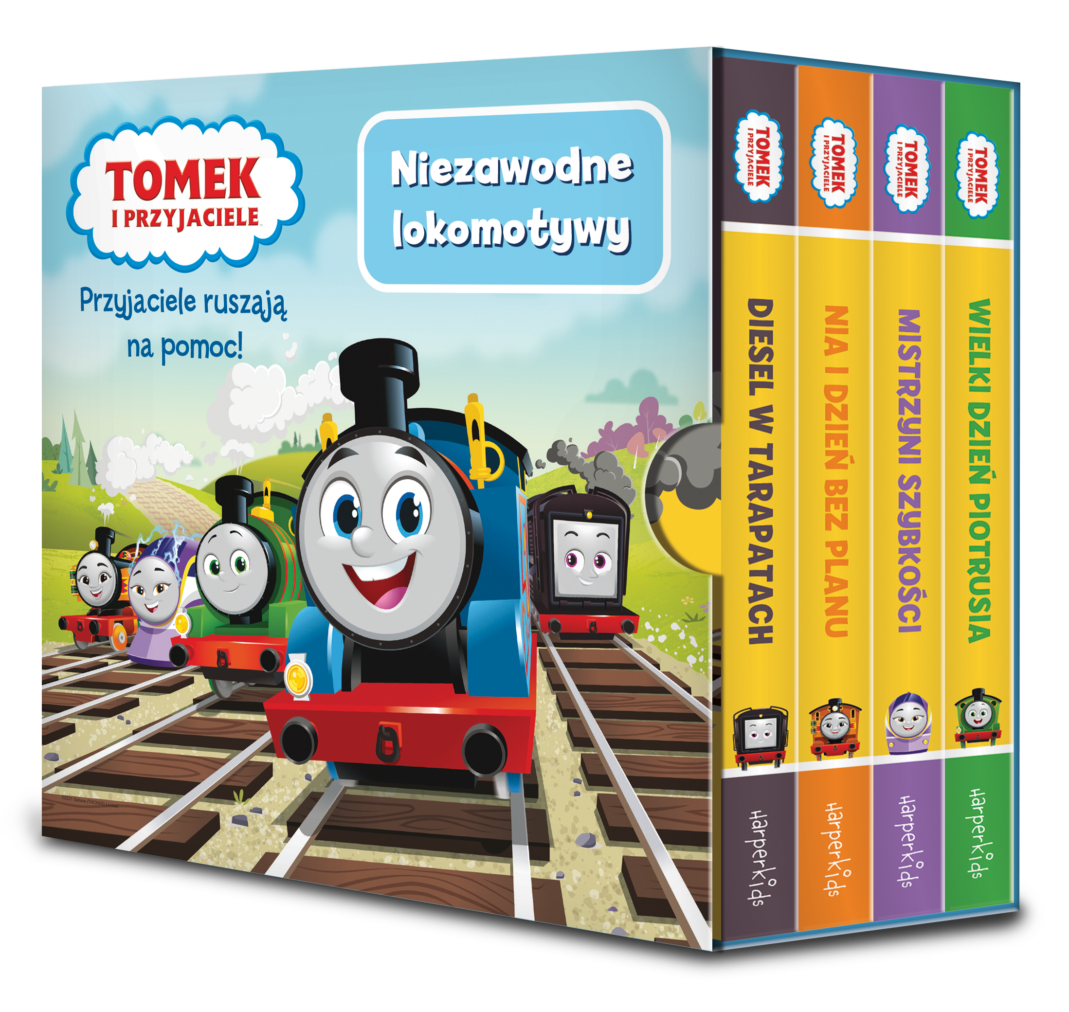 Moja pierwsza biblioteczka to kolekcja 4 uroczych książeczek w pięknym etui – idealny prezent dla najmłodszych czytelników. Na wyspie Sodor nie zawsze wszystko idzie zgodnie z planem. Wiedzą o tym lokomotywy, które każdego dnia spotykają niezwykłe przygody a także kłopoty. Na szczęście przyjaciele są zawsze gotowi do pomocy w tarapatach i do wspólnej zabawy. Każda książeczka z kolekcji prostym językiem opowiada przygody Tomka i jednej lokomotywy z wesołej ekipy jego przyjaciół. Książeczki mają format wygodny dla małych rąk i bezpieczne zaokrąglone rogi. Kolorowe ilustracje sprawią, że mały czytelnik będzie chciał wracać do czytania i oglądania obrazków w nieskończoność. Kolekcja czterech książek Moja pierwsza biblioteczka jest opakowana w wygodne etui, co sprawia że można ją zabrać ze sobą na spacer do parku czy w podróż. Kartonowe strony są odporne na zabrudzenia i odporne na działanie małych rąk. Wielki dzień Piotrusia Mistrzyni szybkości Nia i dzień bez planu Diesel w tarapatach