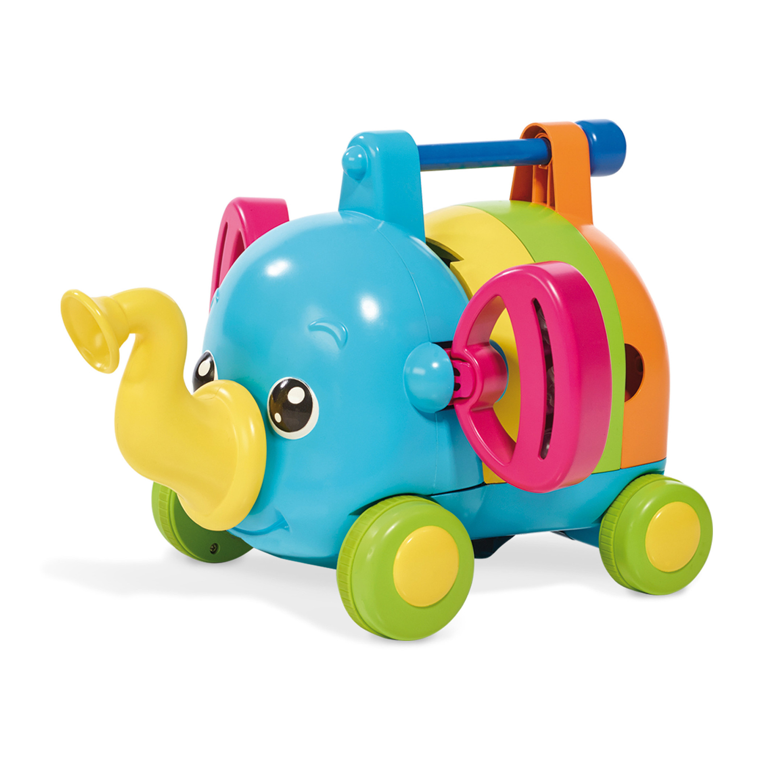 Nosek słonika to trąba, uszy - dzwonki a w korpusie znajdują się cymbałki, bębenek i harmonijka. Po zabawie łatwo jest złożyć zabawkę, jak kolorowe puzzle. Słonik jedzie popychany przez dziecko – macha uszami i trąbą. Wiek 12m+