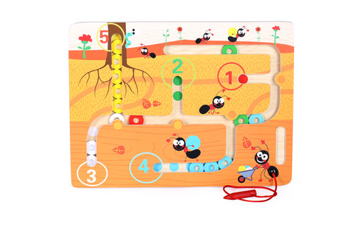 Drewniana układanka – labirynt z krążkami Mrowisko firmy TOP BRIGHT. Przesuwaj krążki po labiryncie korytarzy mrowiska, zaprzyjaźnij się z pracowitymi mrówkami i pomóż im przenosić ich kolorowe skarby do odpowiednich miejsc . Drewniana układanka posiada wycięte korytarze (rynienki), w których umieszczone są kolorowe krążki, które przesuwa się przy pomocy pisaczka, umocowanego sznureczkiem do planszy, zaś po zabawie można go umieścić w specjalnym miejscu na planszy, dzięki czemu się nie zgubi. Zadaniem dziecka jest umieszczenie w odpowiednim miejscu, określonej ilości krążków w danym kolorze. Poznaj świat i codzienne życie mrówek, sprawdź jaka to wspaniała zabawa! Ze względu na swoje walory edukacyjne zabawka jest wybierana do gabinetów rehabilitacyjnych, logopedycznych, przedszkoli. Wodzenie pałeczką wyrabia ruchy ręki podobne do tych jakie dziecko musi potem wykonywać przy nauce pisania, co jest bardzo dobrym ćwiczeniem połączonym z ciekawą zabawą. Oprócz tego zabawka pomaga w nauce liczenia i rozpoznawania kolorów, ale też rozwija logiczne i strategiczne myślenie. Produkt wykonany jest z ekologicznego, wysokiej jakości drewna, bez BPA. Barwione nietoksyczną farbą na bazie wody, zgodnie z najwyższymi międzynarodowymi standardami bezpieczeństwa zabawek. W skład zabawki wchodzą: - drewniana plansza - labirynt, - pisak - umocowany sznureczkiem do planszy. Wymiary produktu: 29,6x22,1x1 cm. Zabawka przeznaczona dla dzieci: 24M+.