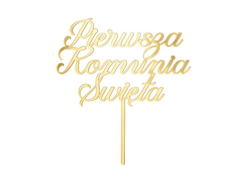 Topper akrylowy na tort ''Pierwsza Komunia Święta'' w kolorze złotym, wysokość ok. 16.5 cm, szerokość około 15 cm.