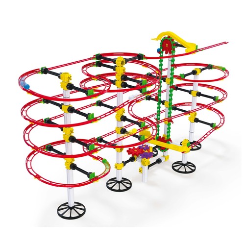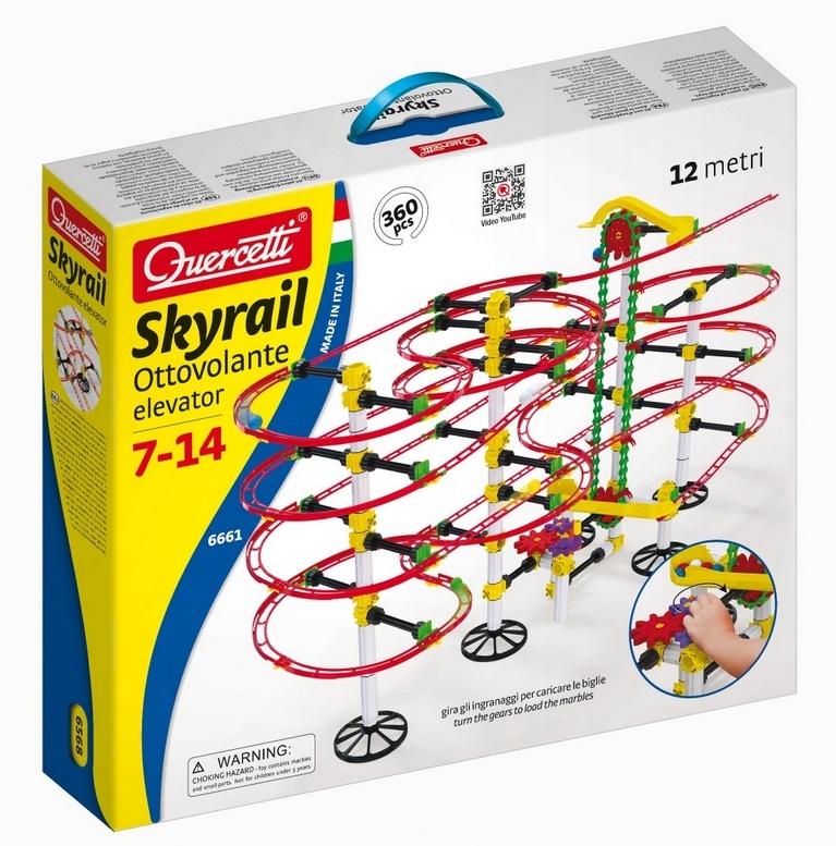 QUERCETTI TOR KULKOWY SKYRAIL OTTOVOLANTE ELEVATOR, ten zestaw składa się z 360 giętkich i niełamliwych części jak tory, cięgna, kołowrotki, łączniki oraz kulki. Za pomocą windy wykonanej z łańcucha i korbki, opadające grawitacyjnie kulki można przemieścić na górę trasy. W zabawie można odwzorowywać modele zamieszczone na instrukcji lub eksperymentować i budować własne konstrukcje. Długość toru 12m. Zabawka stymuluje kreatywność, rozumowanie przestrzenne oraz rozwija zdolności manualne. Zabawka została wyprodukowana we Włoszech.