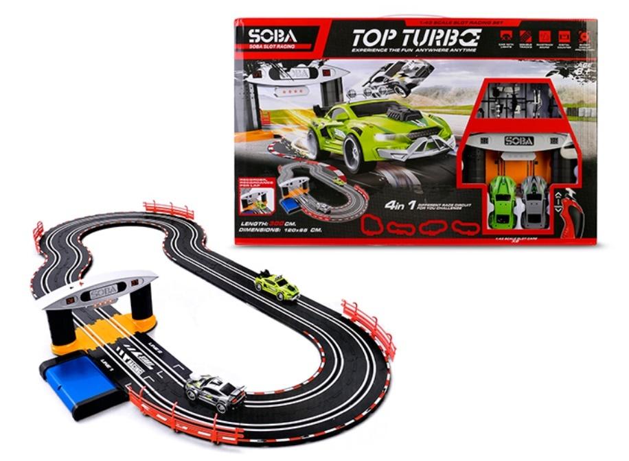 W ZESTAWIE: 2 SAMOCHODY WYŚCIGOWE ZE ŚWIECĄCYMI ŚWIATŁAMI, 2 PILOTY, ELEMENTY DO ZŁOŻENIA TORU W 4 WARIANTACH, DŁUGOŚĆ TORU 300 CM., PODŚWIETLANA LINIA METY, ZASILACZ, WYM. OPK: 64 X 40 X 6 CM., 3+