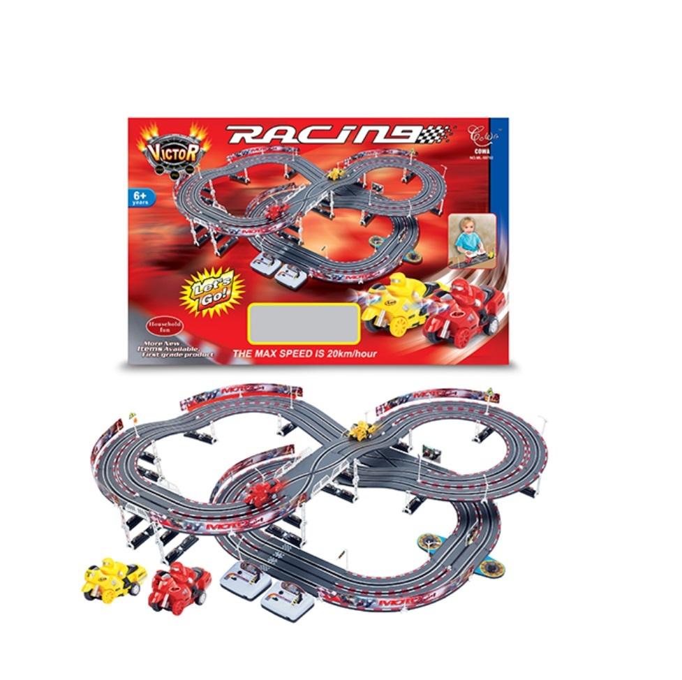 TOR WYŚCIGOWY 154 EL., W ZESTAWIE: 2 POJAZDY, 2 PILOTY, TOR, ZNAKI, SŁUPY, SYGNALIZACJA, BARIERKI, LICZNIK OKRĄŻEŃ, DŁUGOŚC TORU 492 CM., FUNKCJE: REGULACJA PRĘDKOŚCI DO 20 KM/H, WYM. OPK: 72 X 47 X 6 CM., 6+
