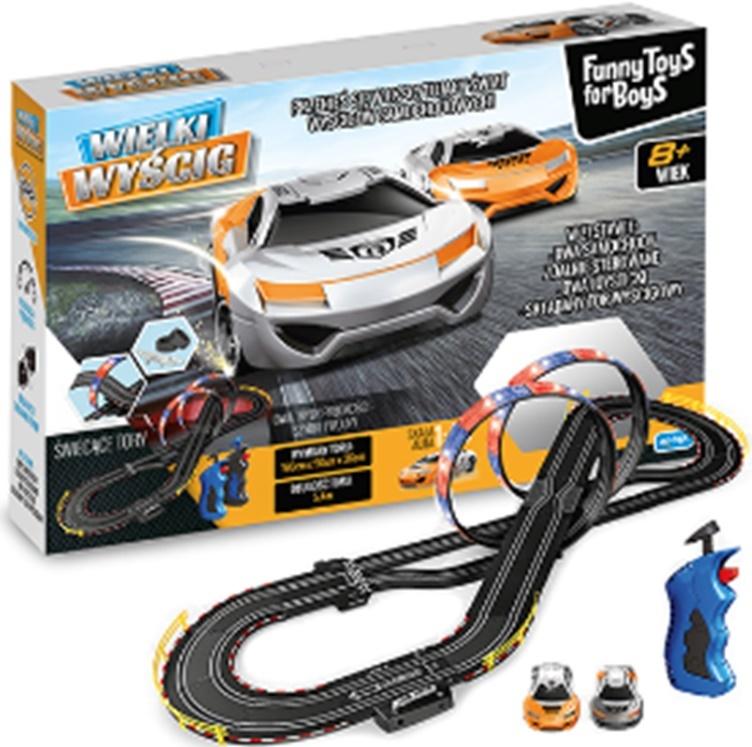 W zestawie: 2 auta, 2 piloty, świecące tory, znaki drogowe, barierki, ładowarka.