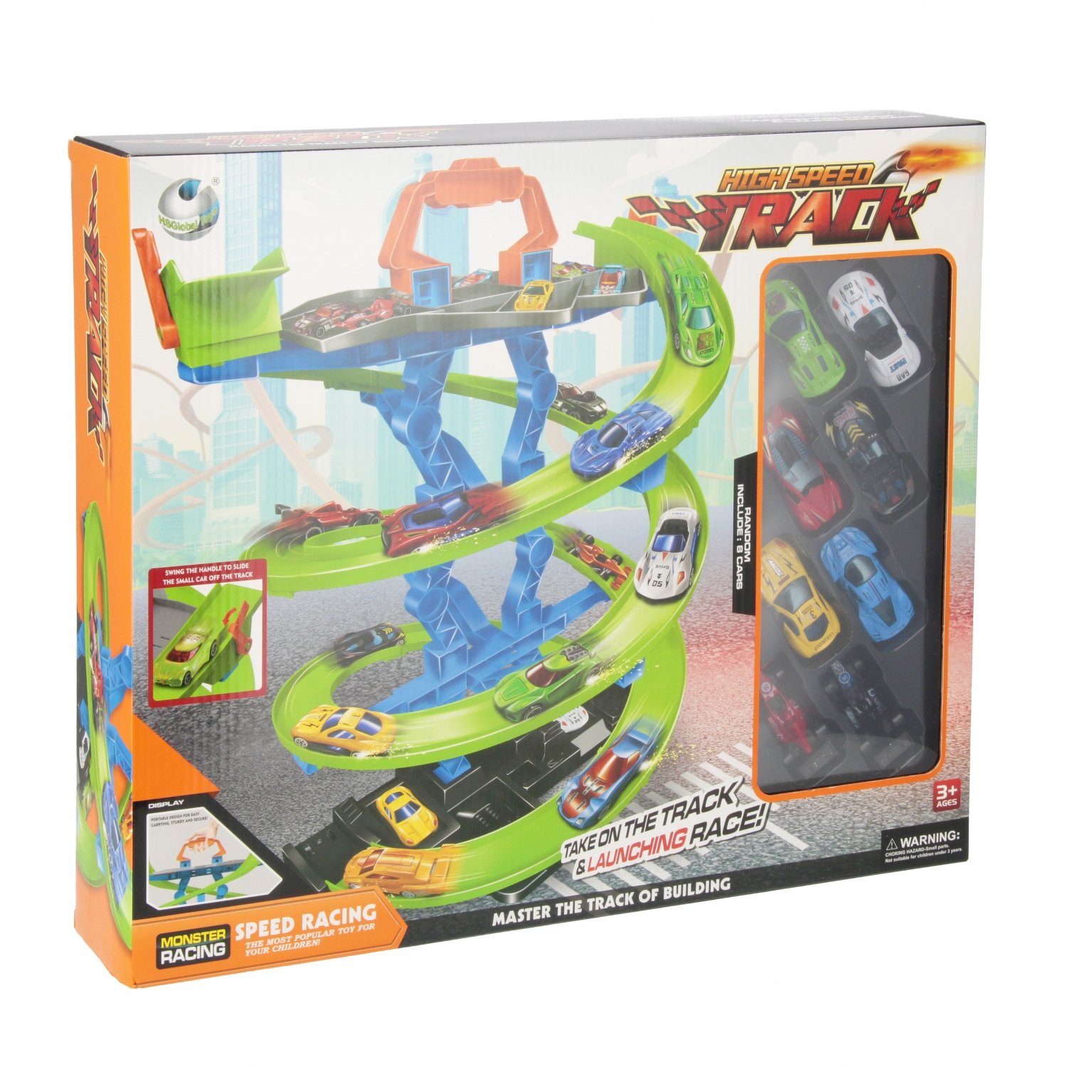 Zawartość zestawu: tor samochodowy, 8x samochód wyścigowy, akcesoria do zbudowania toru.