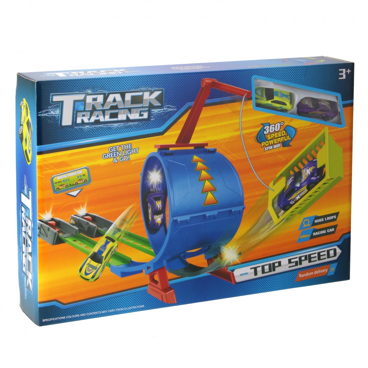 Zestaw zawiera dynamiczną trasę z widowiskową pętlą, po której samochodziki mkną z zawrotną prędkością.
