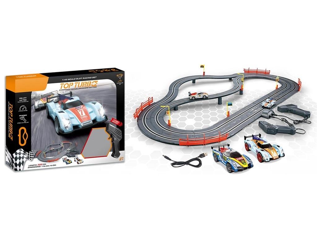 W zestawie: tory, 2 samochody ze światłami, 2 piloty, kabel USB, akcesoria