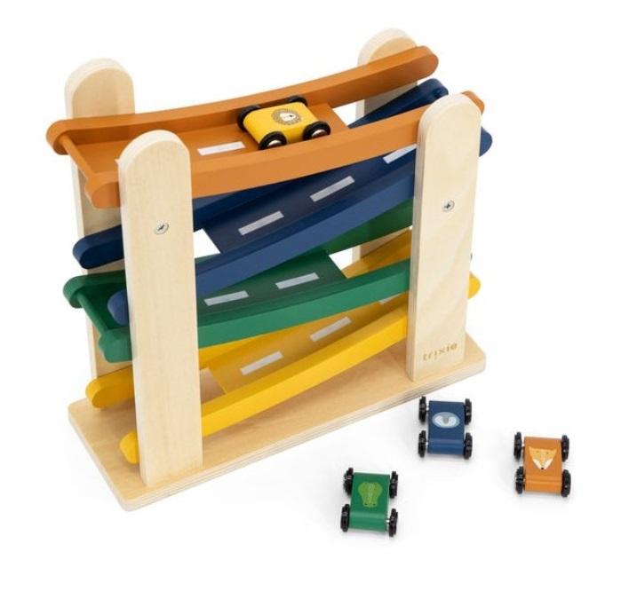Wspaniały Tor Wyścigowy Drewniany, który gwarantuje wiele godzin radosnej zabawy! Zestaw zawiera wielopoziomowy tor wyścigowy i 4 samochody, każdy w innym kolorze z emblematem wesołych zwierzaków. Wystarczy ustawić samochód na górze i obserwować, jak zjeżdża w dół, przeskakując na kolejne tory. Zabawa torem wyścigowym pobudza naturalną ciekawość i rozwija wyobraźnie najmłodszych. Tor Wyścigowy marki Trixie Baby wykonany jest z najwyższej jakości drewna bukowego i sklejki FSC(C), co przekłada się na bezpieczeństwo dzieci i przyjazność dla środowiska. Wiek: 18 m+
