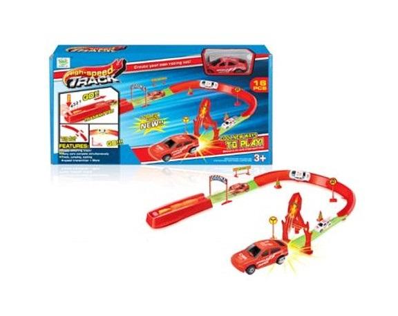 Zabawka tor dla dzieci z wyrzutnią. Niech Twój samochód poleci jak najdalej. Zestaw składa się z 16 elementów i zawiera 1 samochód wyścigowy. Produkt zapakowany w kartonowe opakowanie z przezroczystym okienkiem.Produkt dla dzieci od 3 lat.
