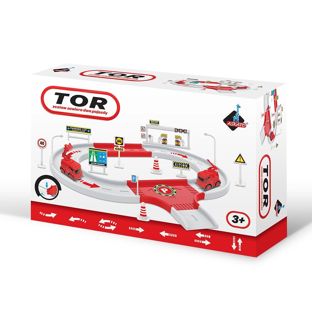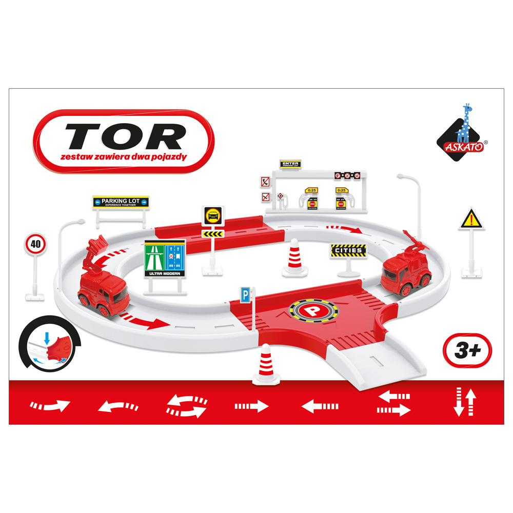 Tor samochodowy w zestawie z dwoma autami straży pożarnej, znakami drogowymi, lampami, stacją benzynową. Wymiary rozłożonego toru - 44 x 37 cm Wymiary opakowania: 28 x 7 x 19 cm