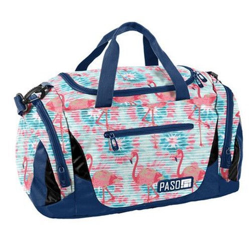 Torba sportowa. Idealna na zajęcia sportowe, fitness bądź krótkie wyjazdy. Pojemna komora główna, mała kieszeń na froncie, 2 kieszenie boczne (w tym jedna na obuwie). Dwa uchwyty do przenoszenia, pasek na ramię z osłonką.