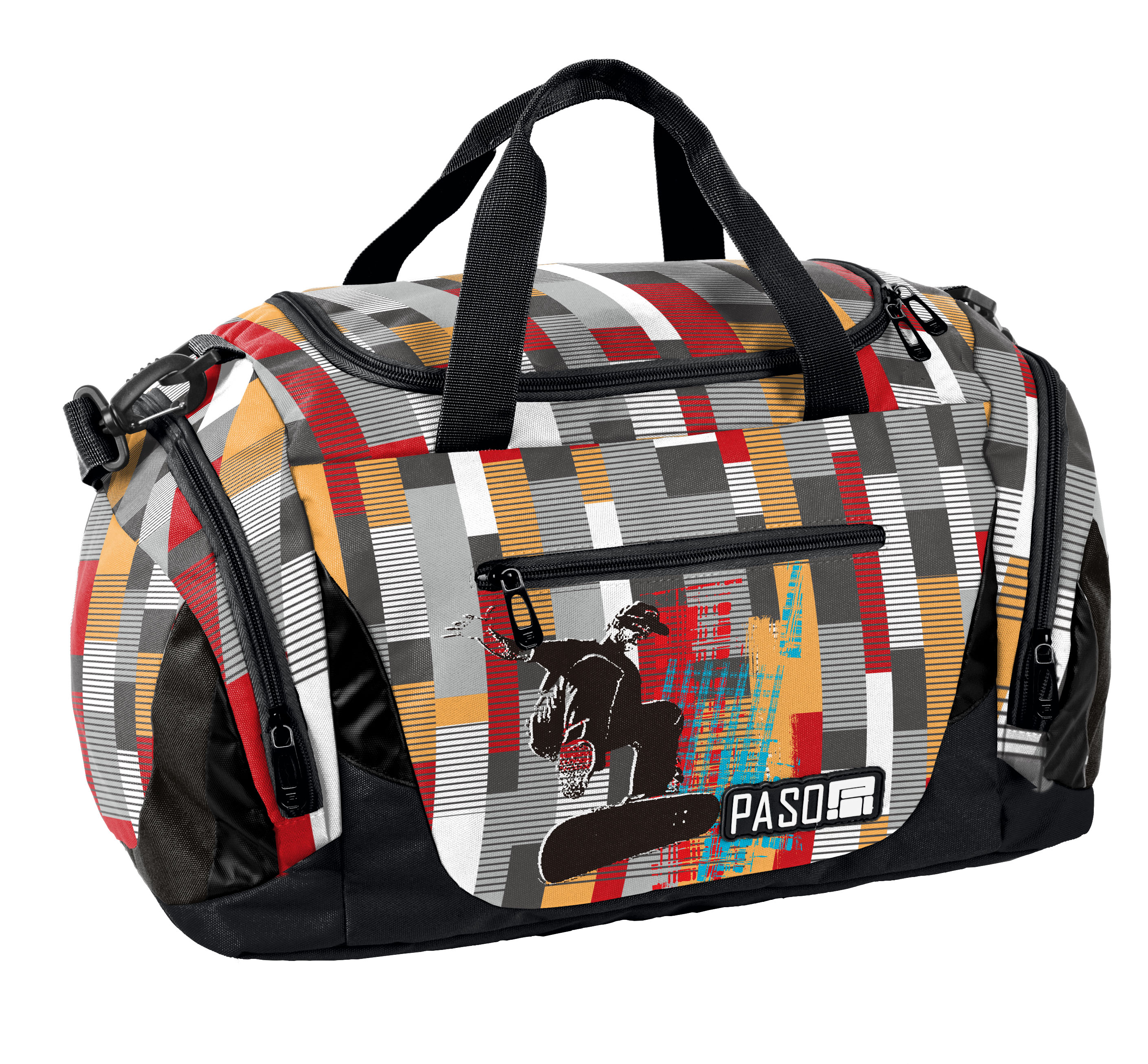 Torba sportowa. Idealna na zajęcia sportowe, fitness bądź krótkie wyjazdy. Pojemna komora główna, mała kieszeń na froncie, 2 kieszenie boczne (w tym jedna na obuwie). Dwa uchwyty do przenoszenia, pasek na ramię z osłonką. Materiał Polyester/PVC Rozmiar 25X47X25 cm waga 480 g