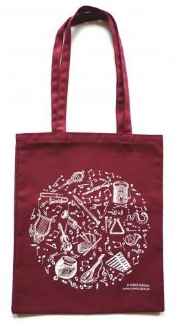Torba płócienna z instrumentami w kolorze bordowym. Posiada długie uszy.