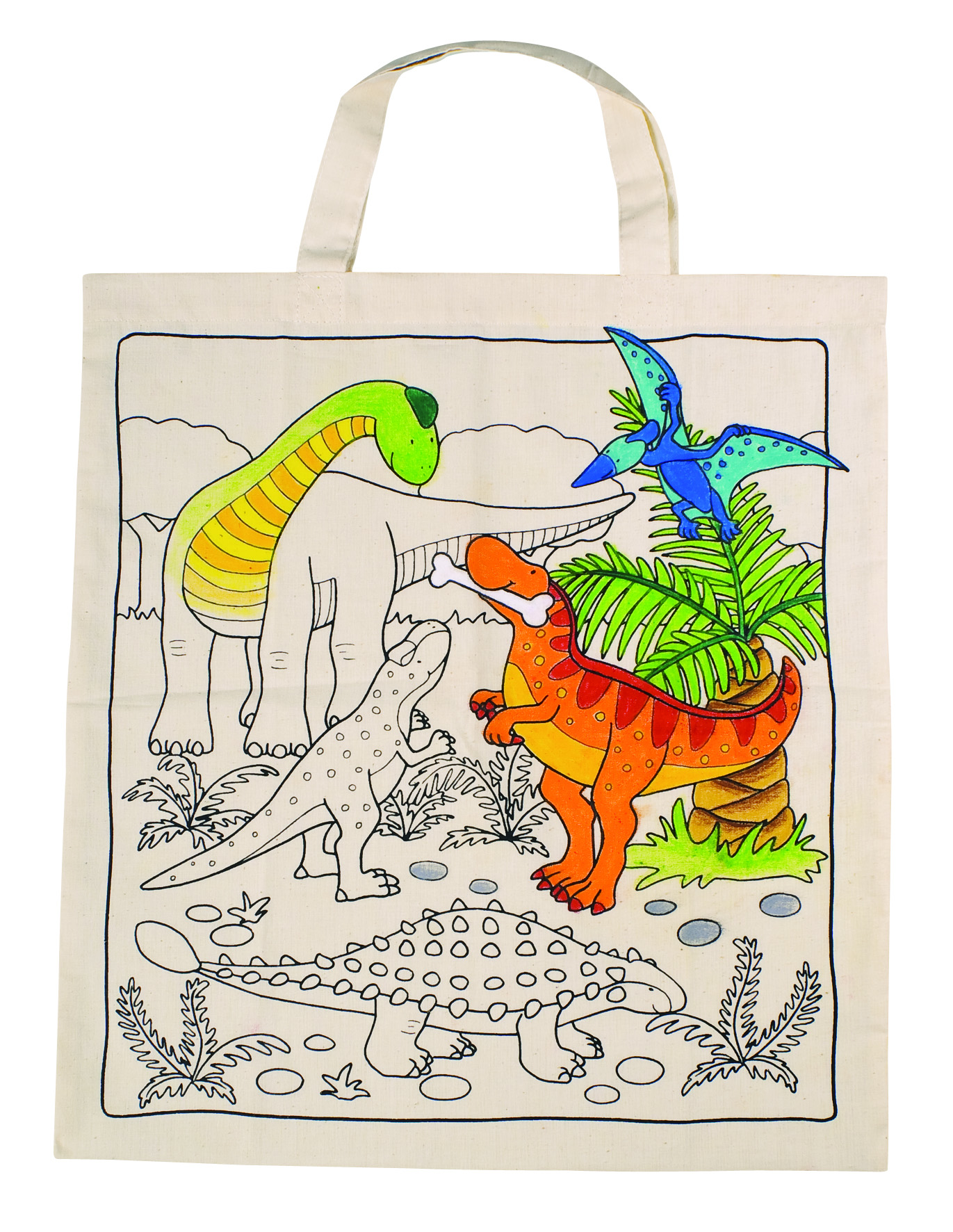 Biała torba z czarnym wzorem do pokolorowania. Pomalowane według własnego pomysłu dinozaury nadadzą jej niepowtarzalnego charakteru. 4+