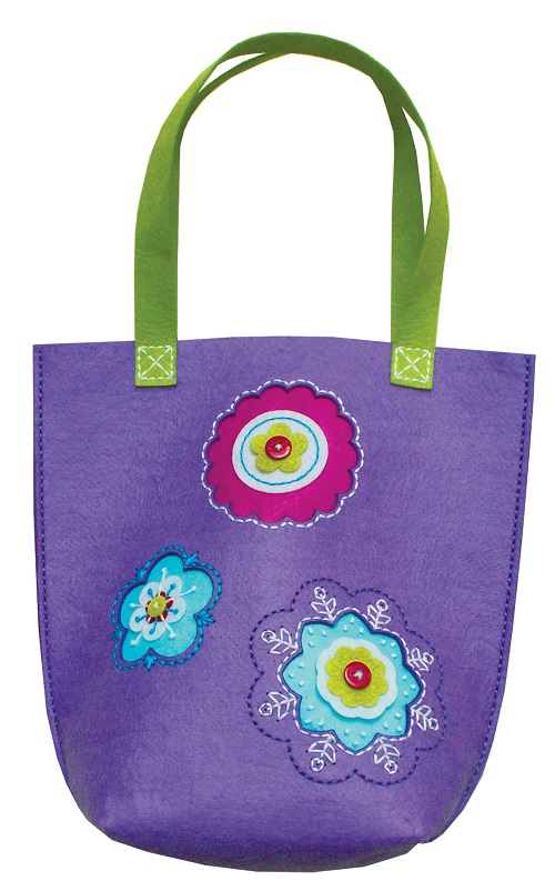 Zestaw do uszycia torby zawiera: filcowe elementy gotowe do zszycia, guziki, bawełniane nici, plastikową igłę oraz instrukcję