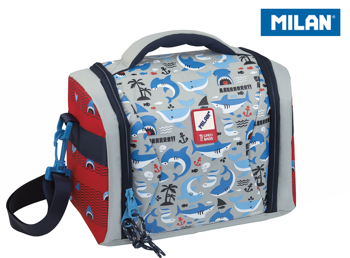 Izotermiczna duża torba MILAN na żywność z kolekcji Shark Attack szara. Posiada izolowane na zimno i na gorąco wnętrze dla lepszej konserwacji żywności.Praktyczna kieszeń wewnętrzna na suwak. Regulowany i odpinany pasek. Materiał: poliester na zewnątrz i izotermiczna podszewka. Rozmiar: 24,5 x 20 x 16 cm. Pojemność: 3,5 litra.