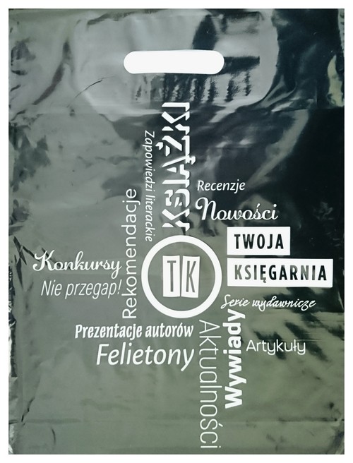Czarna, z białym nadrukiem torba foliowa „Twoja księgarnia”. Folia grubości 55 mikronów, nie wymaga odprowadzania opłaty recyklingowej. Wielkość 30 cm x40 cm, opakowanie zawiera 50 sztuk.